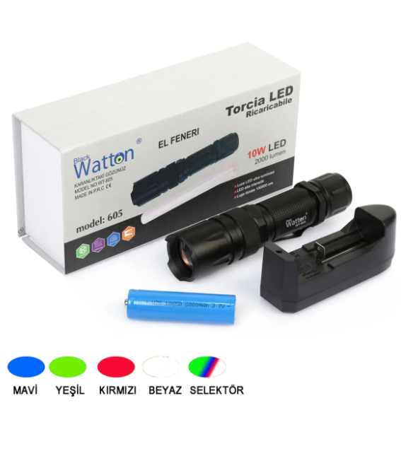 10W 2000 Lümen 4 Renk Güçlü El Feneri WT-605 ile profesyonel aydınlatma yeteneğini keşfedin! Bu üstün performanslı fener, etkileyici 2000 lümen parlaklık ve 10W LED gücüyle olağanüstü bir aydınlatma gücü sunar. Özellikle avcılık ve taktik amaçlı kullanımlar için vazgeçilmezdir.